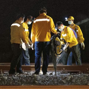 3月21日,在玉林至铁山港铁路线上,工人在打磨铁轨。
