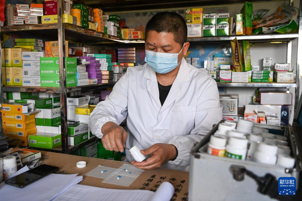3月20日,在广西昭平县昭平镇玉河村卫生室,李荣坚在给患者配药。