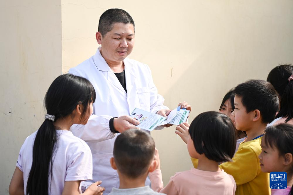 3月20日,在广西昭平县昭平镇玉河村,李荣坚给学生们发放健康知识宣传单。