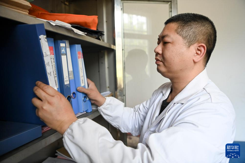 3月20日,在广西昭平县昭平镇玉河村卫生室,李荣坚在整理村民的健康档案。