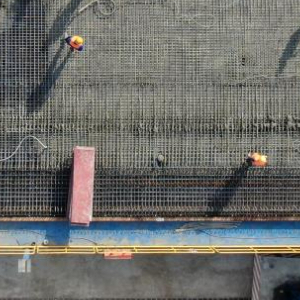 3月20日,施工人员在西十高铁中铁上海工程局蓝田制梁场的箱梁胎具上标记定位(无人机照片)。