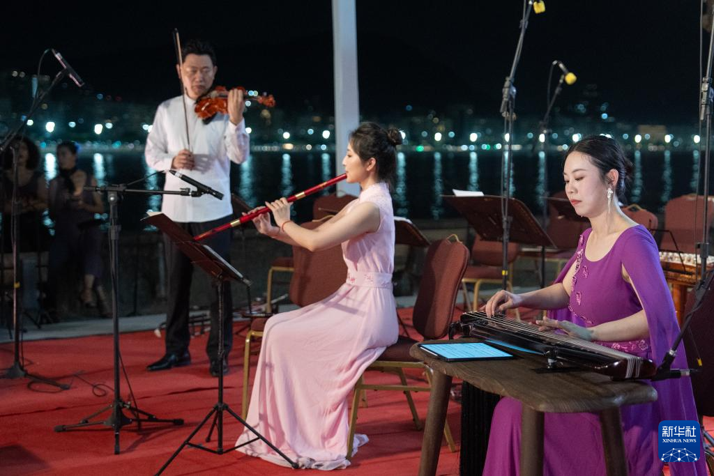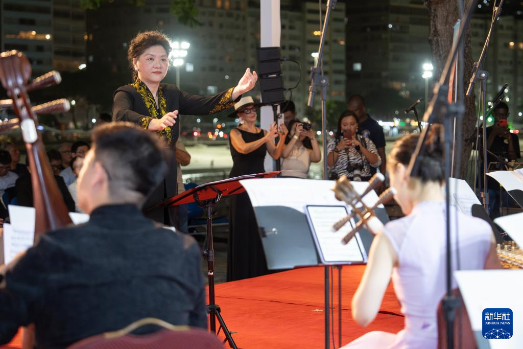 当地时间21日晚,巴西里约热内卢当地民众与华侨华人、中资企业驻巴工作人员在著名的科帕卡巴纳海滩边共同欣赏中国中央音乐学院民族室内乐团带来的音乐会。在这场名为“金钟之星”的中国民族器乐音乐会上,中国的艺术家们演奏了《山丹丹开花红艳艳》《思乡曲》《十面埋伏》《百鸟朝凤》《花梆子》等有代表性的民族乐曲,并通过这些乐曲向巴西民众介绍了琵琶、古筝、唢呐、箫、板胡等中国乐器。
