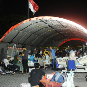 3月22日晚,在印度尼西亚东爪哇省泗水,人们在一家医院外躲避余震。