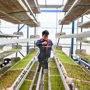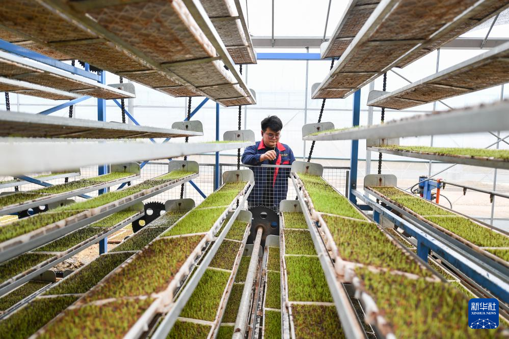 3月22日,在湘潭市雨湖区姜畲镇青亭村的智能化育秧大棚内,农户在查看循环式智能育秧机上的秧苗生长情况。