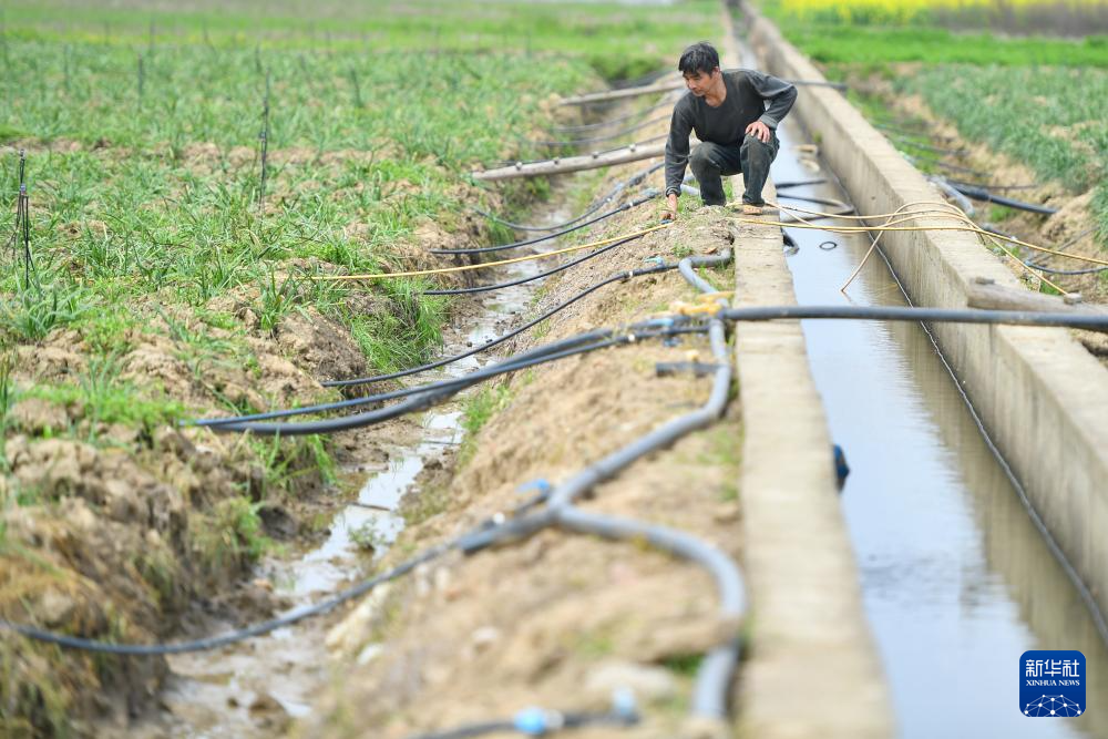 3月22日,在湘潭市雨湖区姜畲镇棋盘村的一处韭菜花种植基地,农户在调试智能水肥一体化设备。