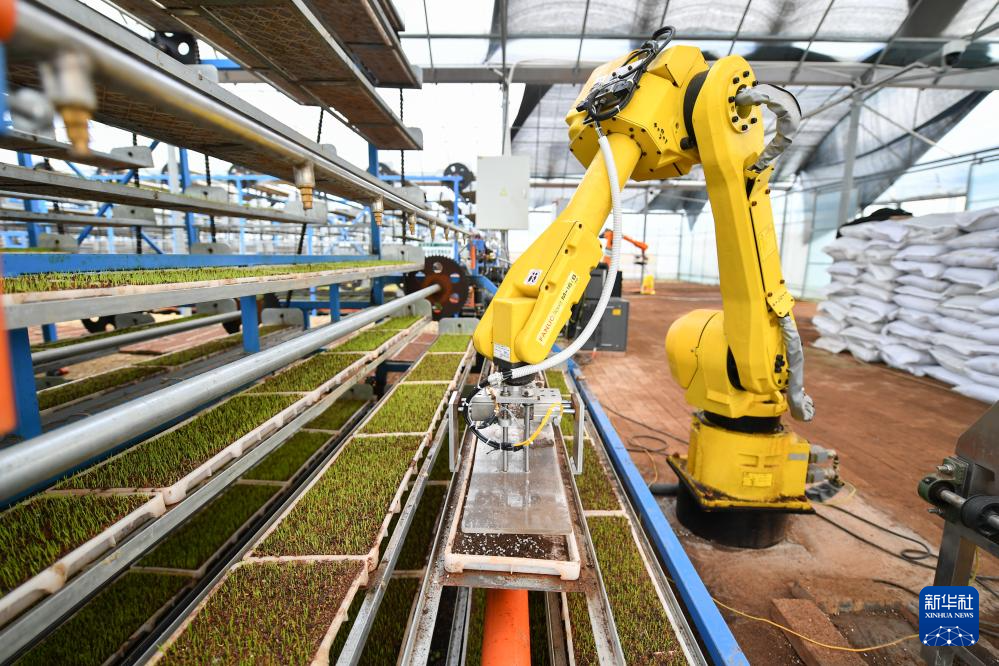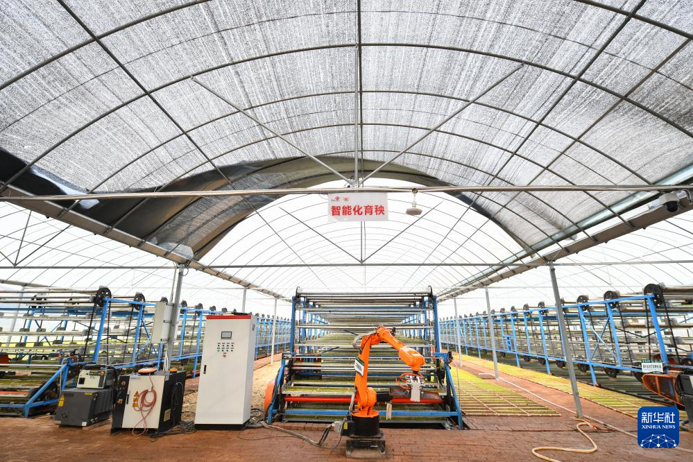 春耕备耕时节,湖南省湘潭市雨湖区姜畲镇的农业大户运用智能机器人、循环式智能育秧机、水稻育秧播种机、智能水肥一体化系统等智能化设施进行水稻育秧和蔬菜育苗,提高劳动效率和种苗质量,助力增产增收。