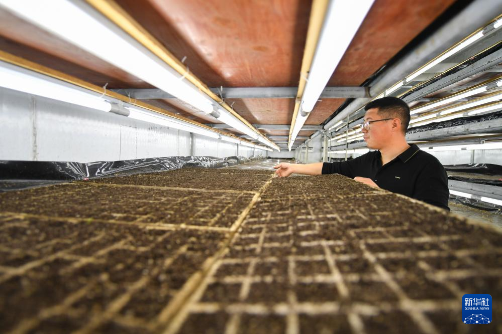 3月22日,在湘潭市雨湖区姜畲镇棋盘村的智能蔬菜温室大棚内,农户在恒温育苗室查看蔬菜苗生长情况。