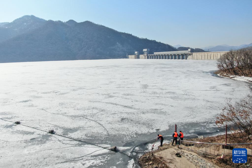 3月20日,崔兵与同事在观音阁水库查看冰面的融化情况(无人机照片)。