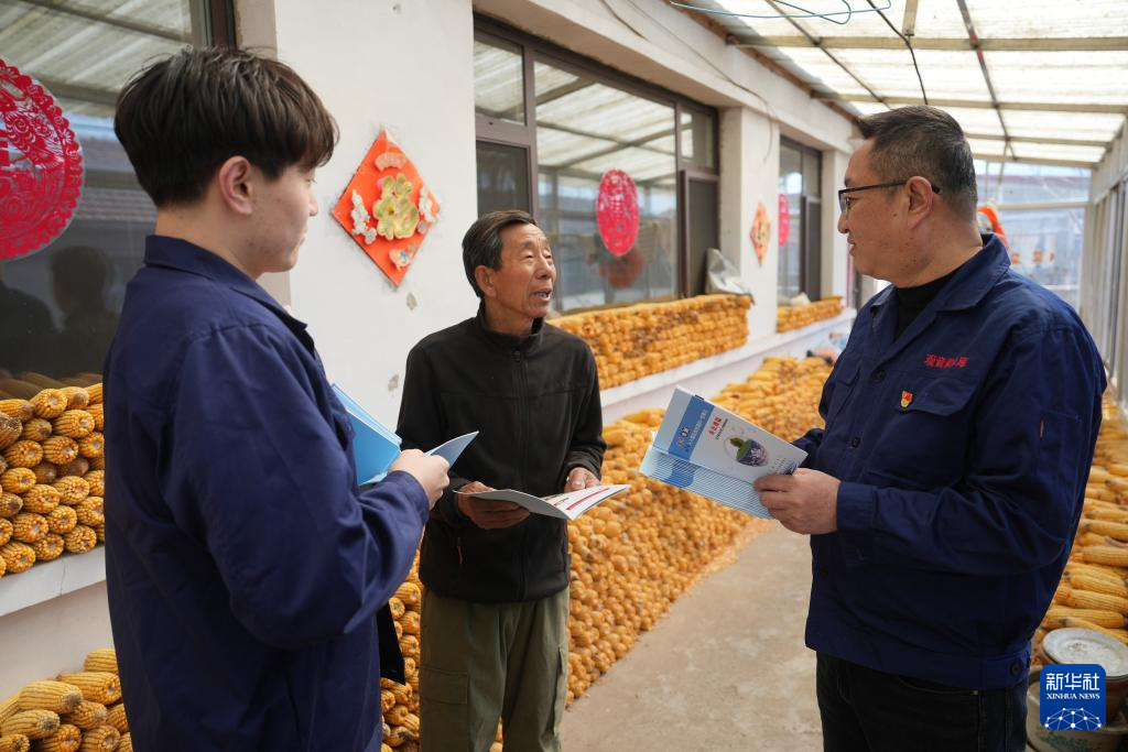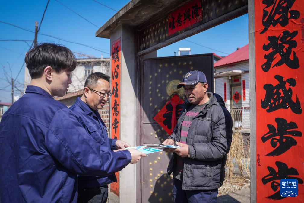 3月21日,崔兵(中)与同事在观音阁水库附近的本溪县上堡村为村民发放水利相关科普材料。