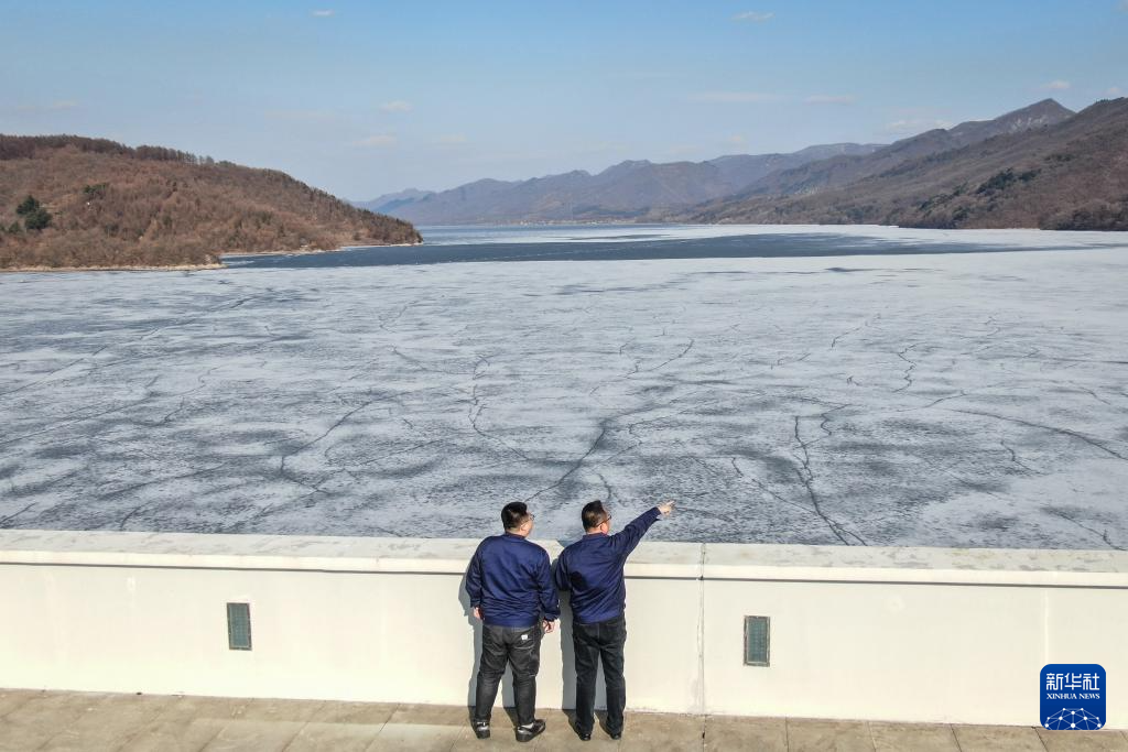 3月20日,崔兵(右)与同事在观音阁水库查看冰面的融化情况(无人机照片)。