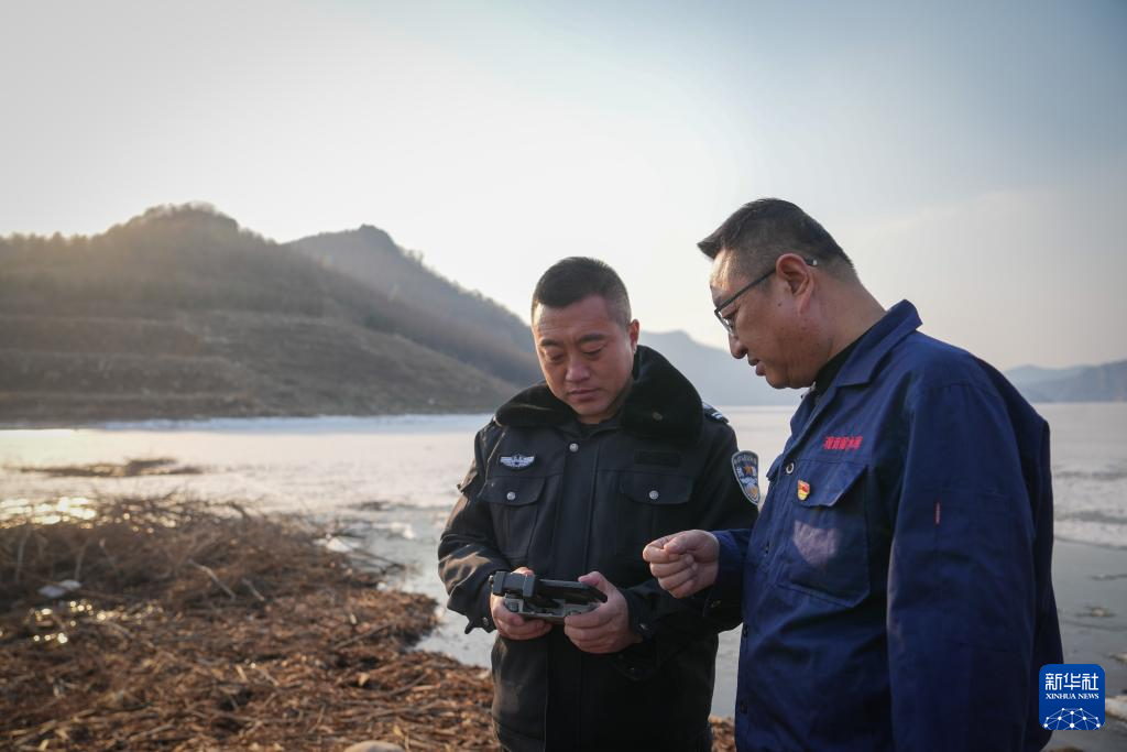 3月20日,崔兵(右)与观音阁水库马城子护库站的护库队员使用无人机进行巡查工作。