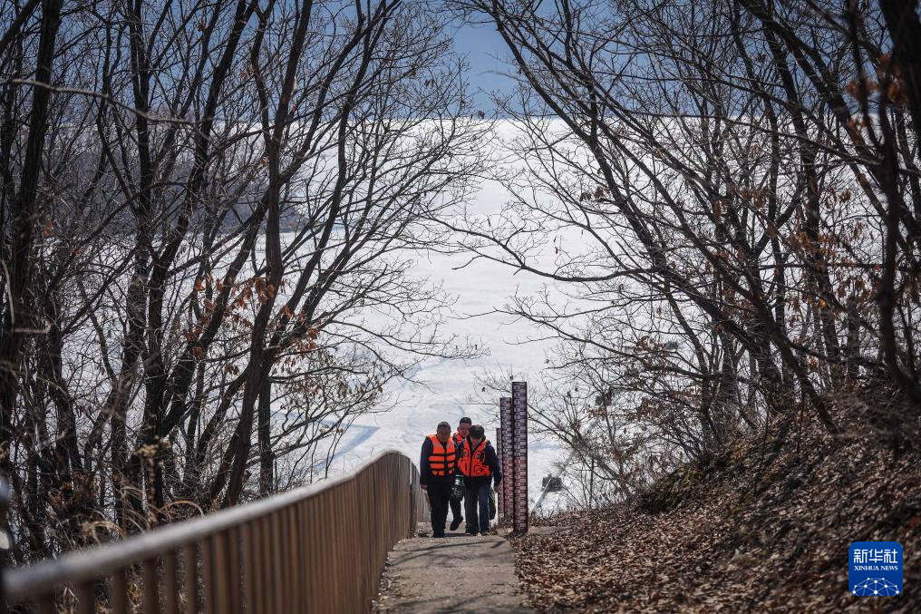 3月20日,崔兵(左)与观音阁水库马城子护库站的护库队员一起巡查。