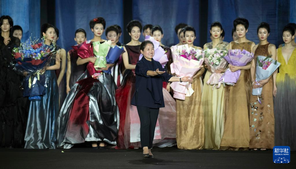 3月22日,设计师李薇(中)在发布会后向观众致意。