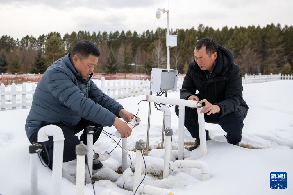 3月22日,在北极村国家基本气象站内,冯显华(左)和郭大勇调整地温采集设备。