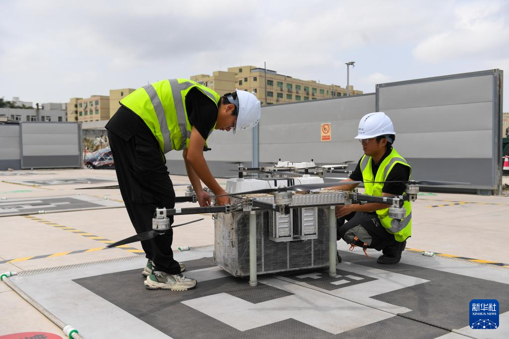 2月28日,在深圳宝安区的丰翼无人机运营中心,地勤人员对无人机进行起飞前的检查。