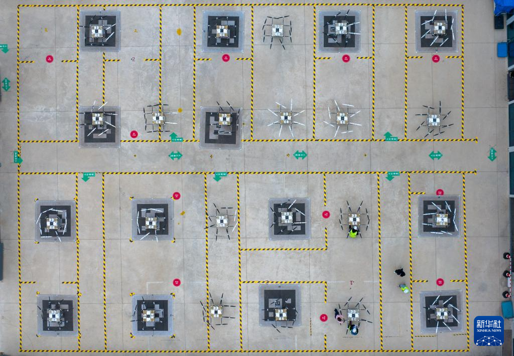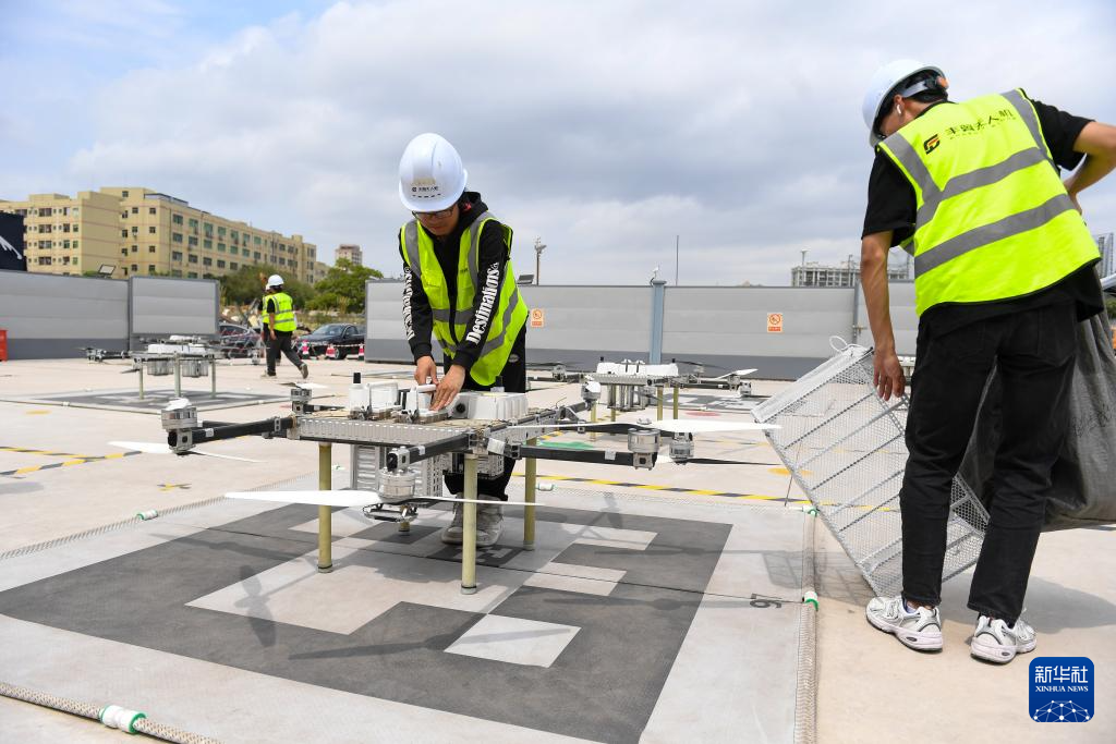 3月23日,在深圳宝安区的丰翼无人机运营中心,搭载着货物的无人机降落。
