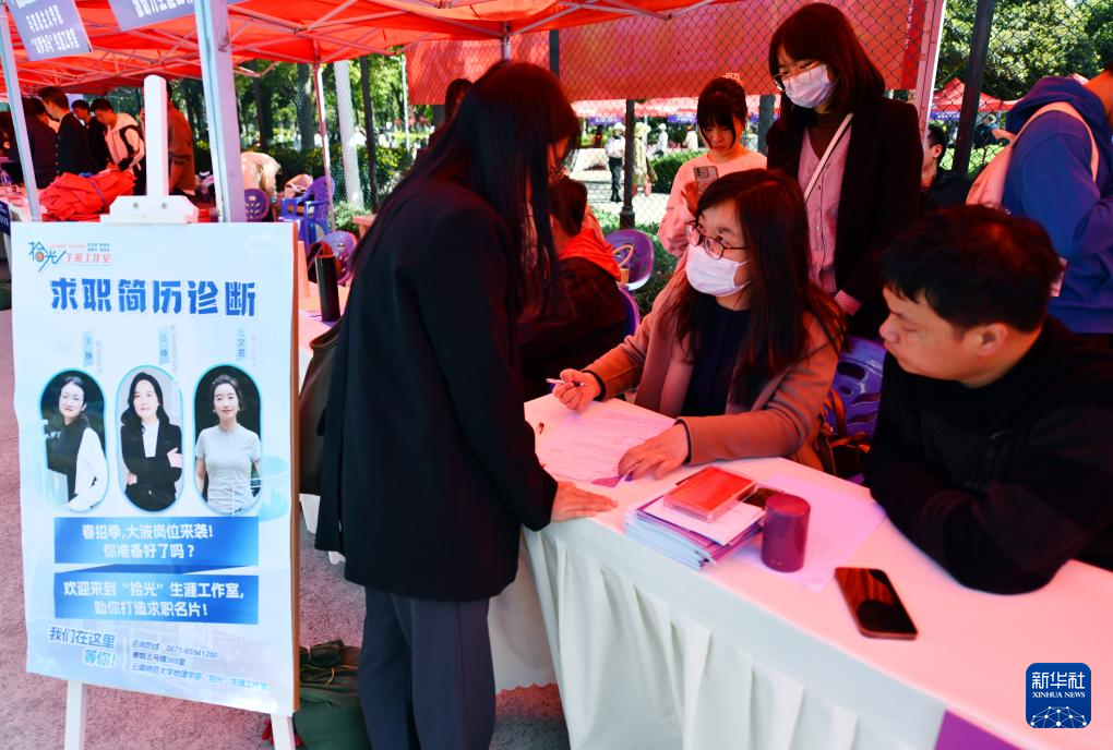 3月23日,老师在招聘会现场为学生进行简历优化指导。