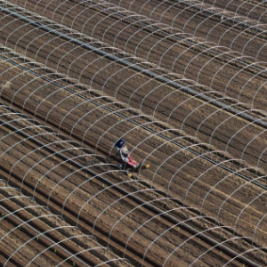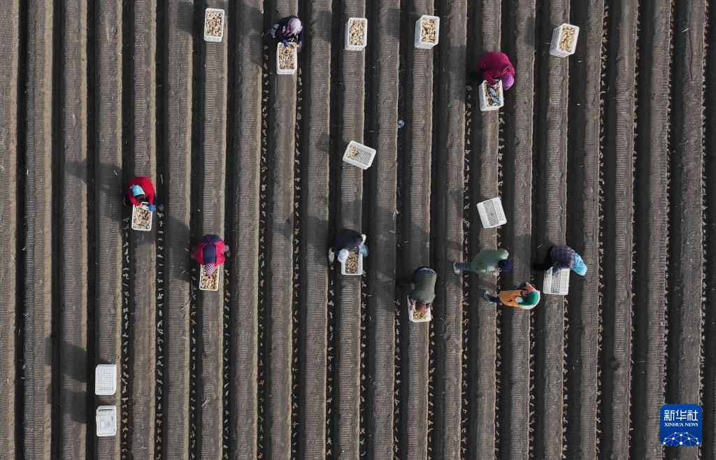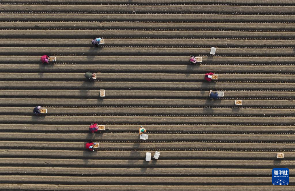 3月24日,河北省唐山市丰润区新军屯镇的农民在田间种植生姜(无人机照片)。