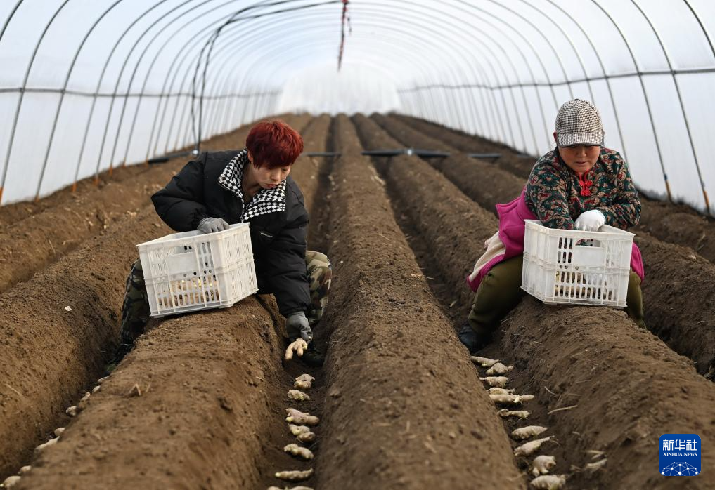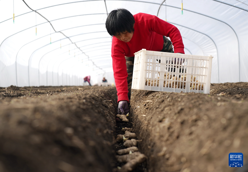 3月24日,河北省唐山市丰润区新军屯镇的农民在大棚内种植生姜。