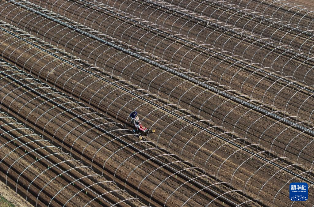 3月24日,河北省唐山市丰润区新军屯镇的农民在田间使用农机开沟,准备种植生姜(无人机照片)。