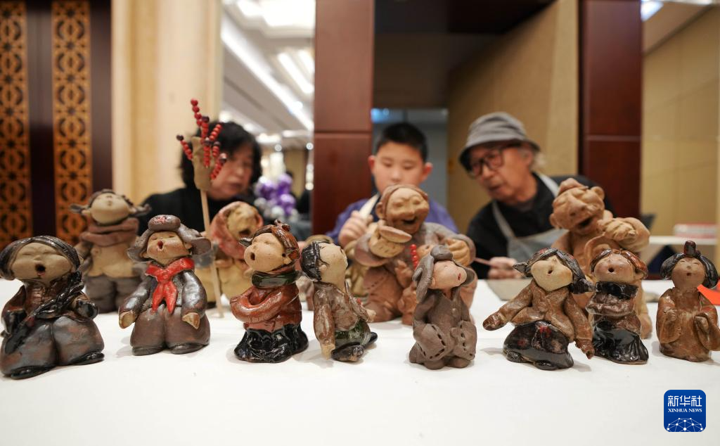 在沈阳一个新春活动上,王辰(后右)和家人一起展示泥人制作技艺(1月17日摄)。