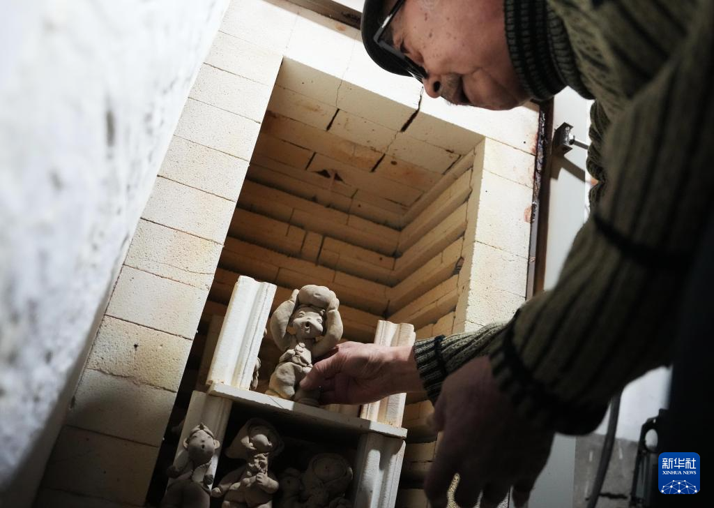 3月21日,王辰在工作室将做好的泥人放入窑内准备烧制。