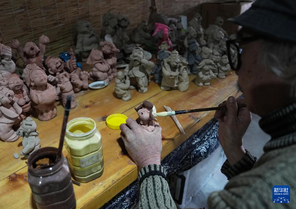 3月21日,王辰在工作室为制作的泥人上色。