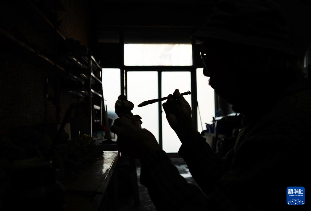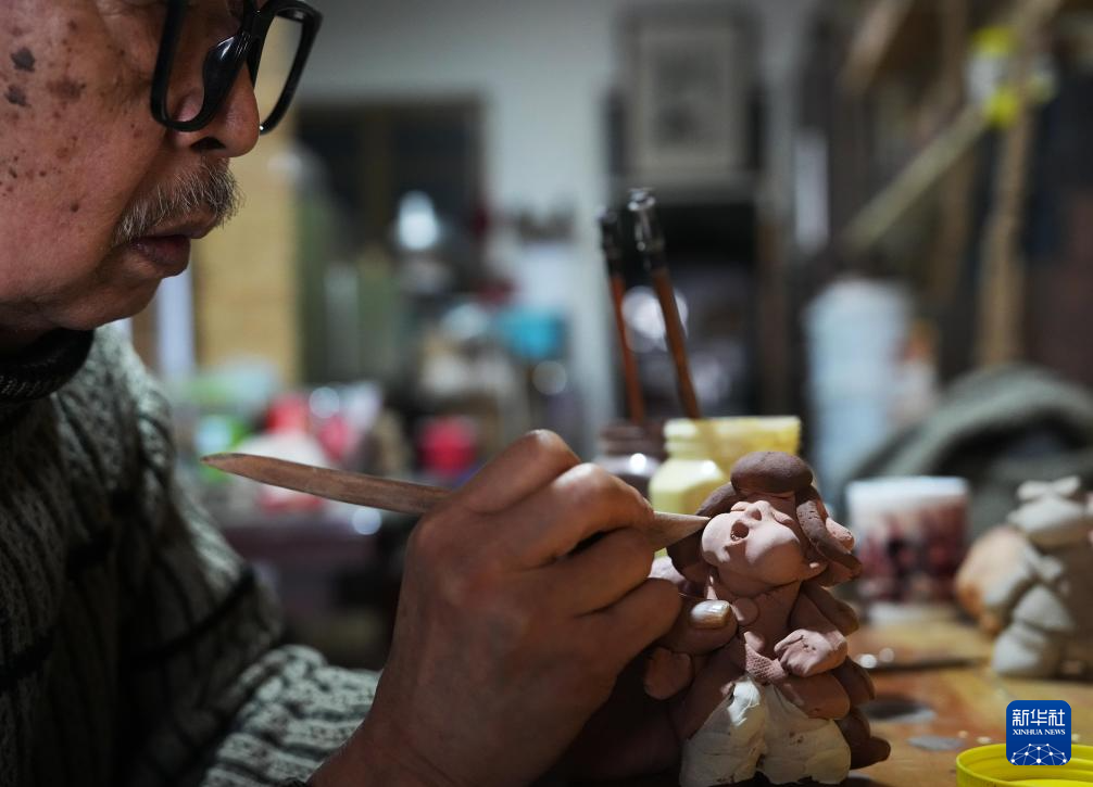 3月21日,王辰在工作室雕琢泥人。