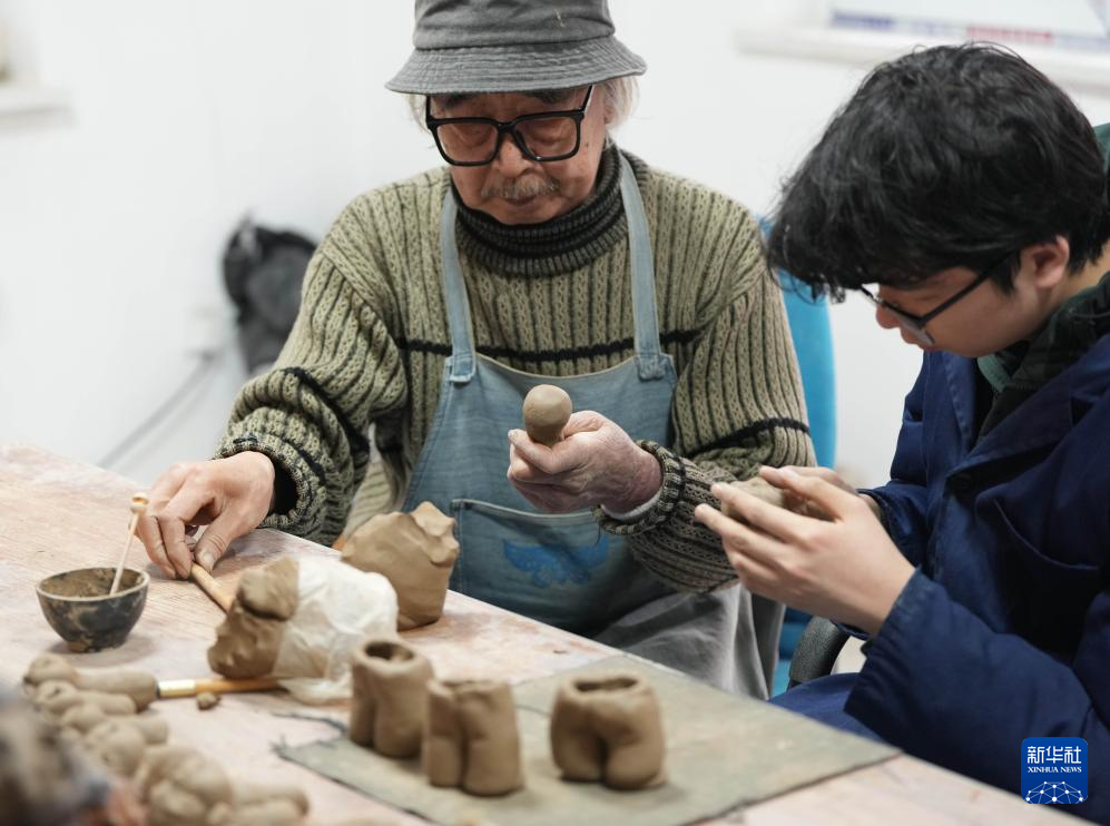 3月22日,王辰(左)在工作室指导学生制作泥人。