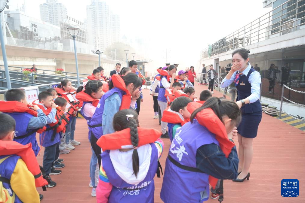 3月24日,福州海事局工作人员在“闽江之恋”号客轮上教学生穿戴救生衣。