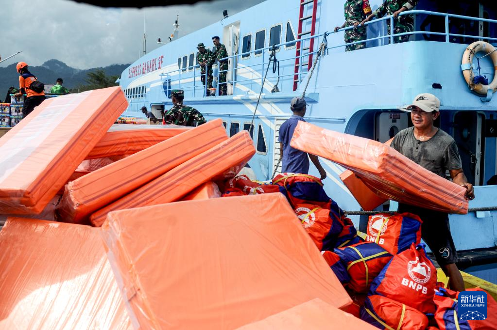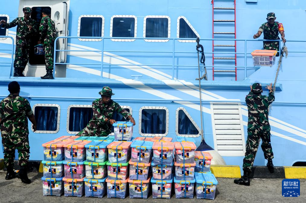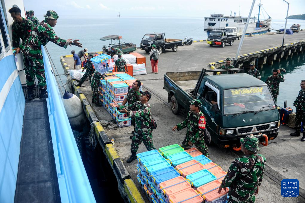 3月25日,在印度尼西亚巴韦安岛,印尼军人搬运印尼国家灾害管理局发放的救援物资。
