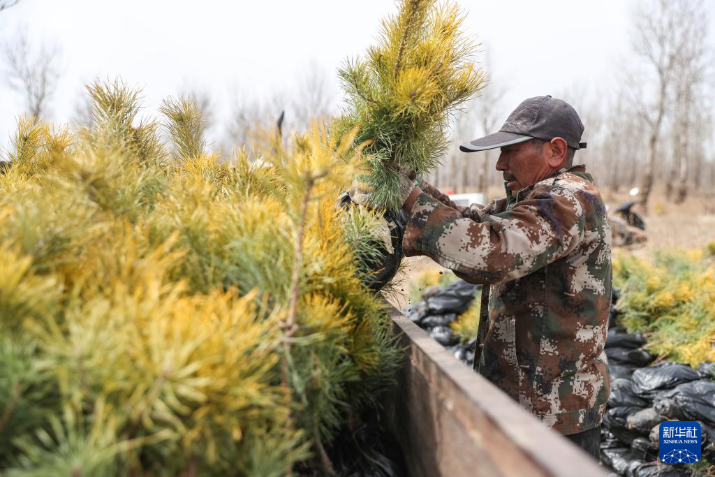 3月25日,辽宁省阜新市彰武县大德镇黄花村村民在搬运树苗。