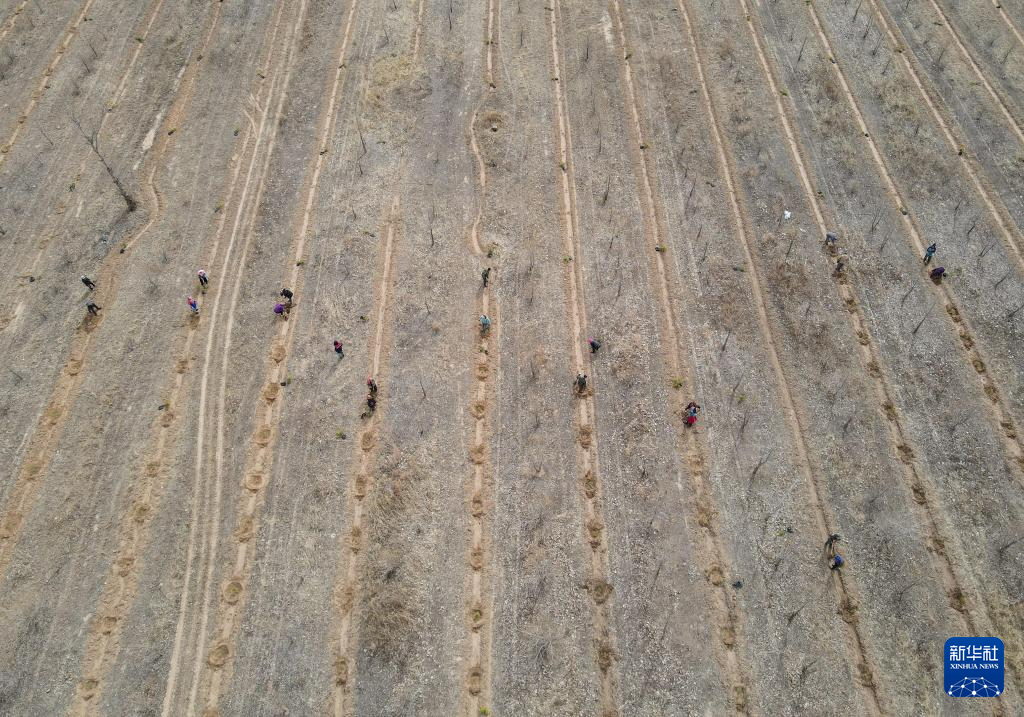 3月25日,辽宁省阜新市彰武县大德镇黄花村村民在植树(无人机照片)。