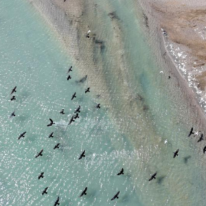 一群水鸟在新疆博斯腾湖上(3月23日摄,无人机照片)。