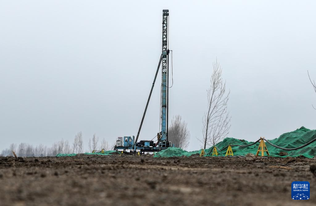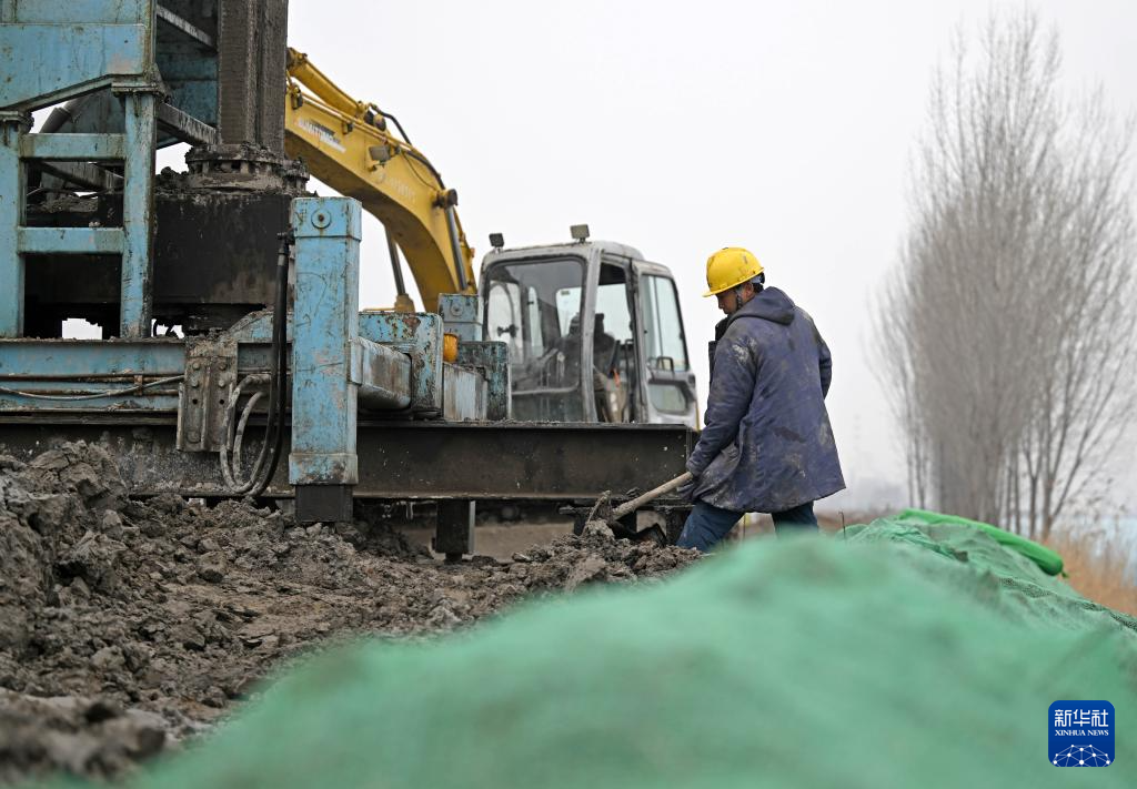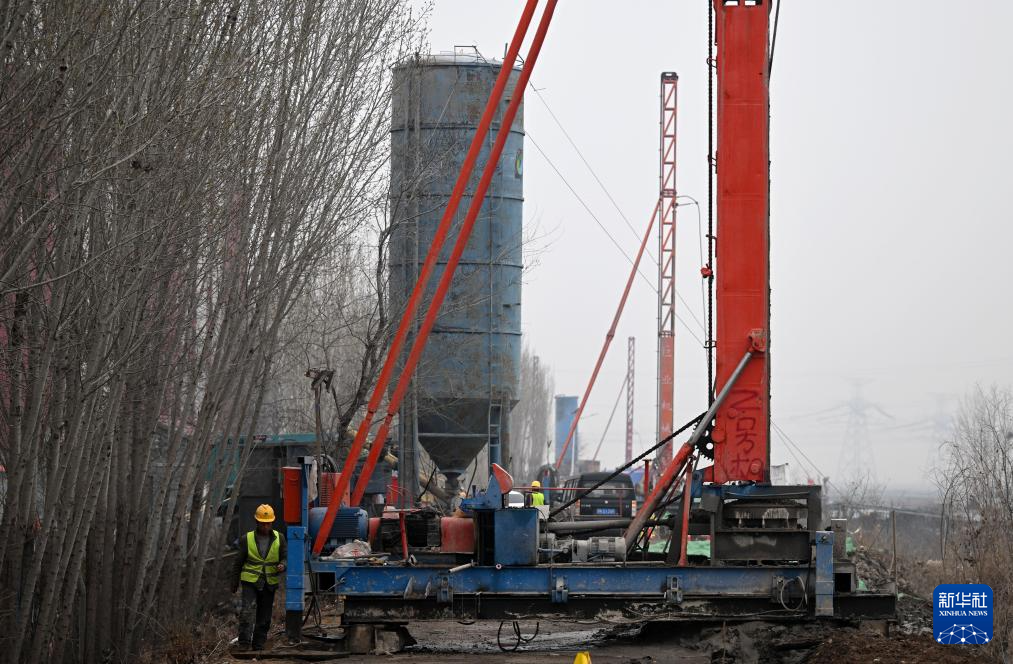 3月25日,高压旋喷桩机在天津市静海区台头北围埝进行加固作业。