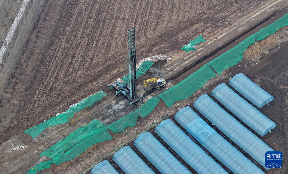 3月25日,一台高压旋喷桩机在天津市静海区台头北围埝进行加固作业(无人机照片)。