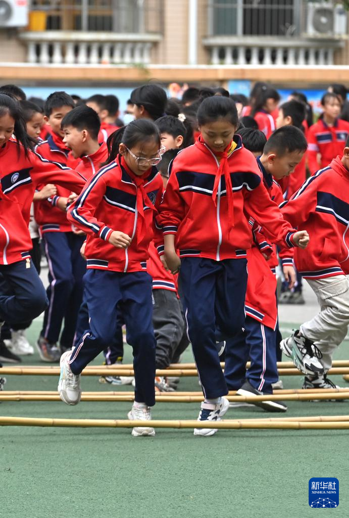 3月26日,在梧州市长洲区新兴二路小学,同学们在课间练习跳竹竿舞。