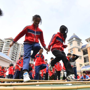 3月26日,在梧州市长洲区龙平小学,同学们在课间练习跳竹竿舞。