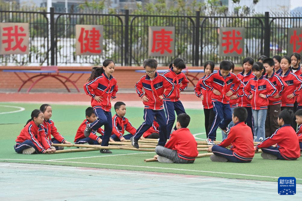 3月26日,在梧州市长洲区新兴二路小学,同学们在课间练习竹竿舞。