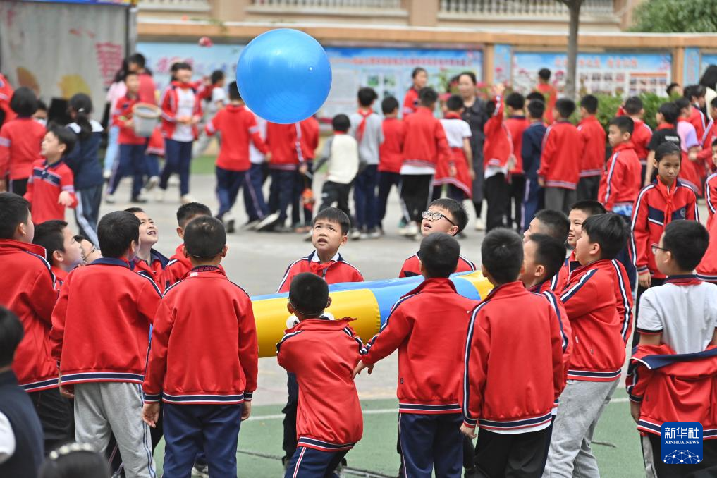 3月26日,在梧州市长洲区新兴二路小学,同学们在课间练习“同心击鼓”。