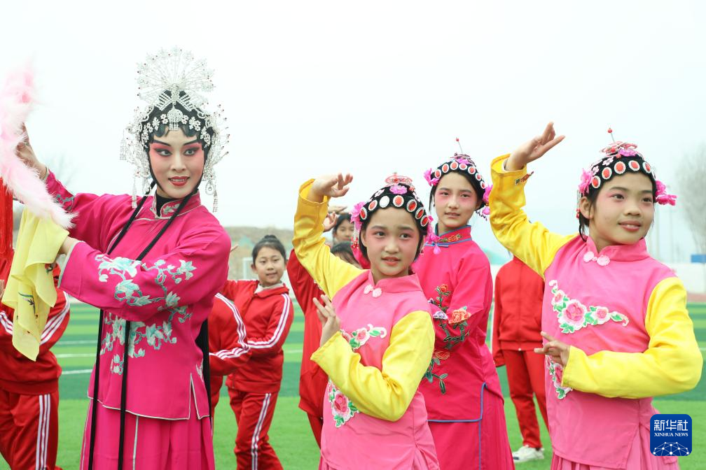 3月26日,在河北省唐山市丰润区泉河头镇团山子小学,评剧演员在教学生戏曲动作。