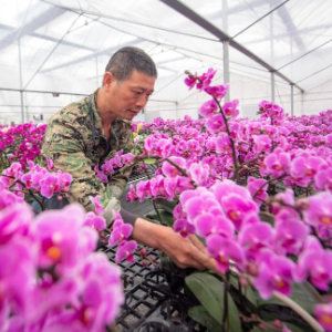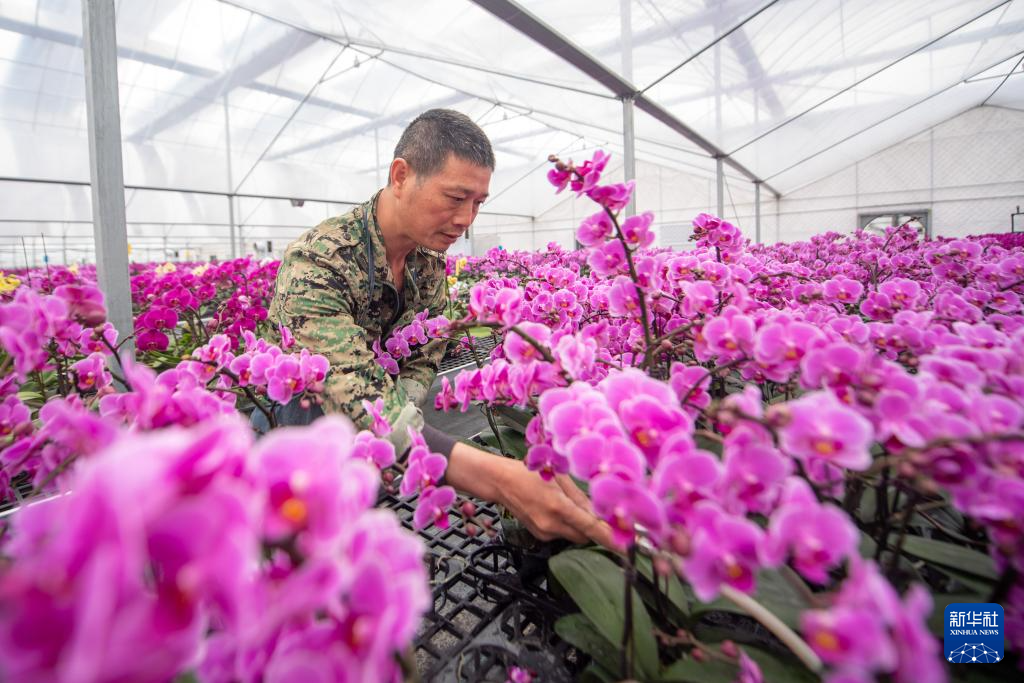 3月26日,农场工人在杭州市钱塘区河庄街道新围村远鸿花卉园艺有限公司的蝴蝶兰培育大棚内工作。