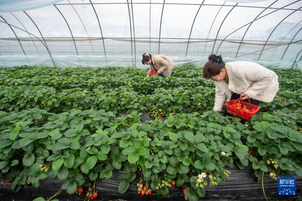 3月26日,游客在杭州市钱塘区河庄街道新江村的草莓种植大棚内体验采摘。