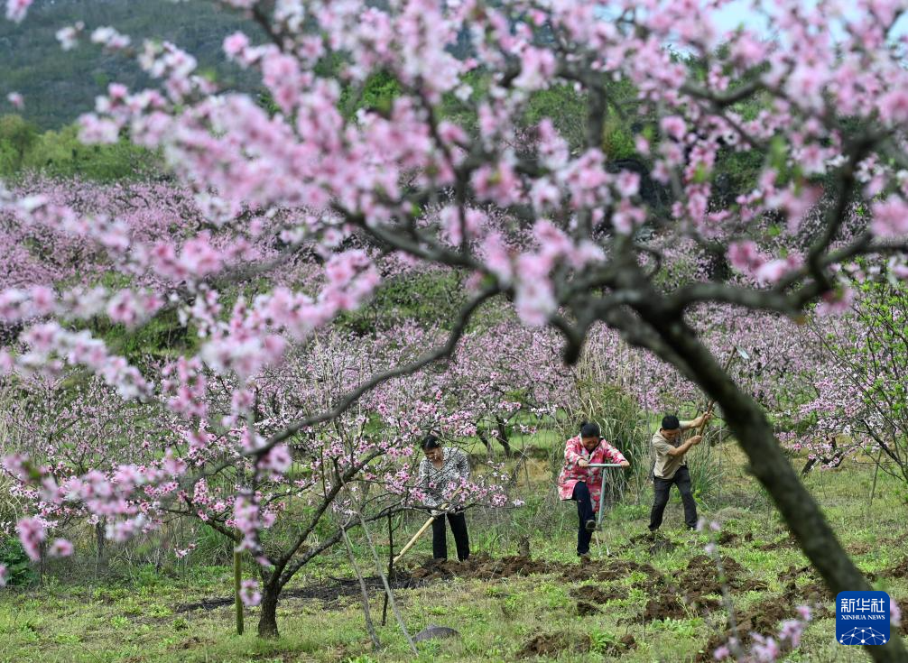 春分时节,广西灌阳县水车镇官庄村桃花大面积开放,当地村民纷纷下地为桃树剪枝、除草、培土和施肥。近年来,灌阳县水车镇官庄村大力发展桃树种植,全村已有3000多亩桃园,是当地群众经济收入一项重要来源。