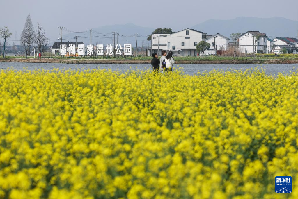 3月27日,游客在鉴湖国家湿地公园东鉴湖畔观赏油菜花。