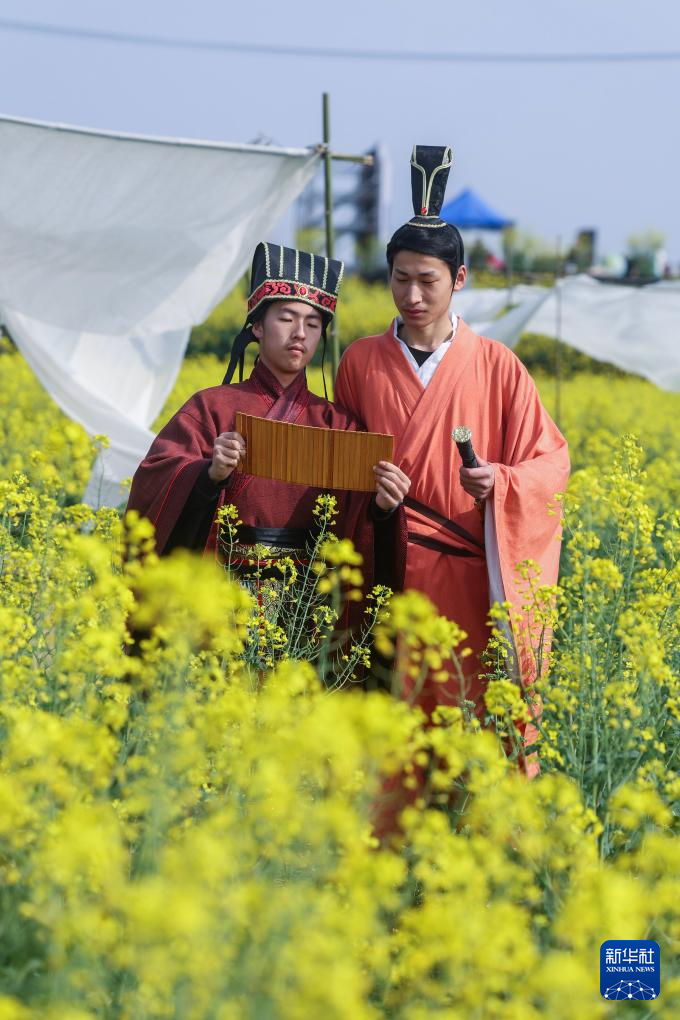 3月27日,身着古装的游客在鉴湖国家湿地公园的油菜花田参加快闪旅拍活动。