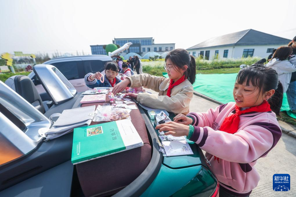 3月27日,孩子们在鉴湖湿地油菜花节上参加共富市集义卖活动。