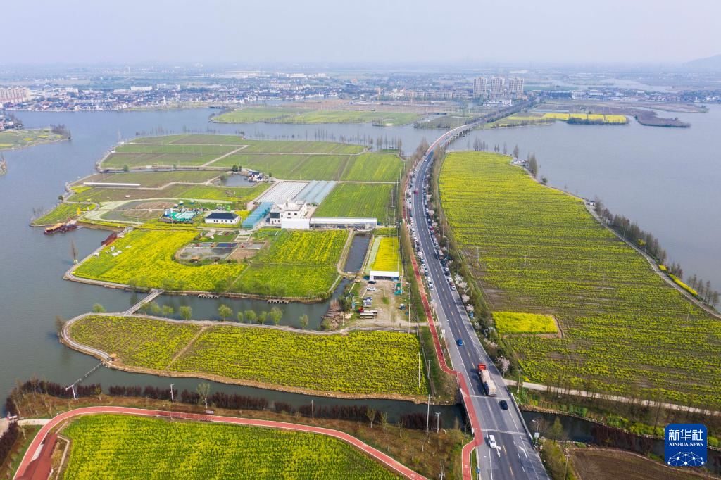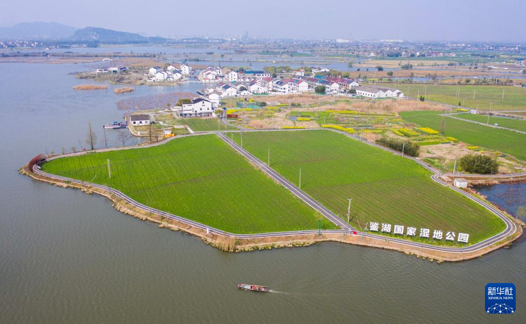 3月27日拍摄的鉴湖国家湿地公园(无人机照片)。