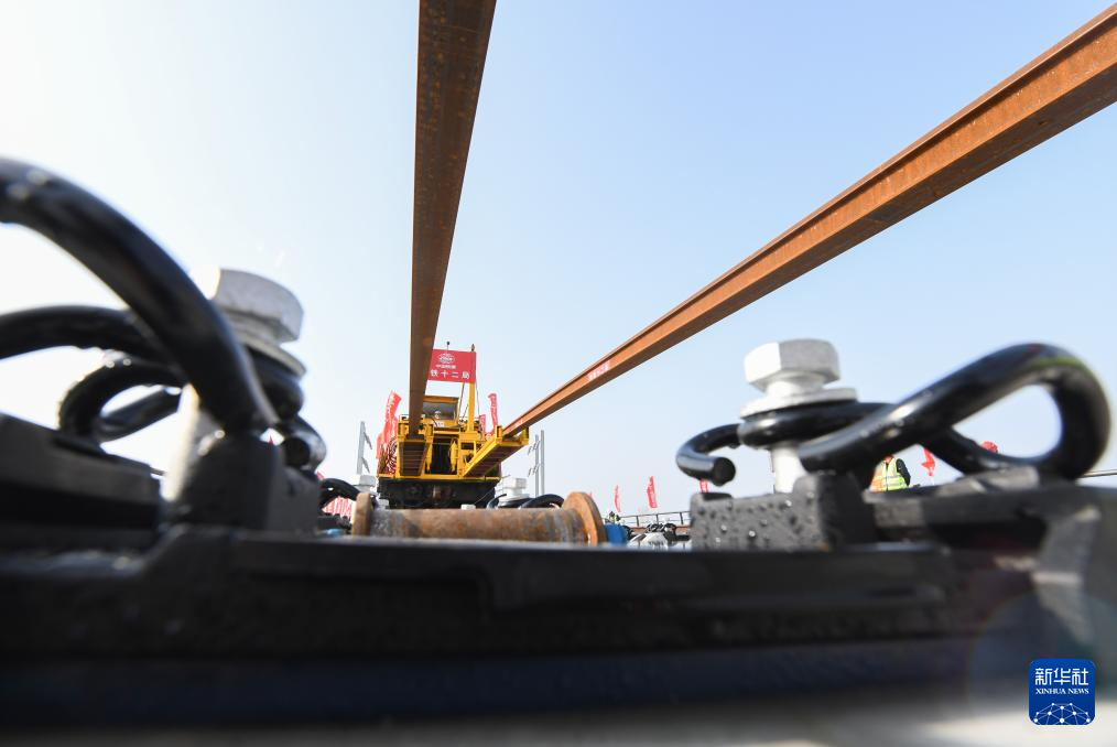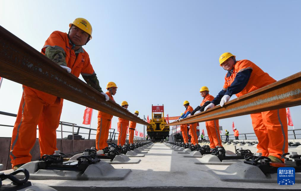 3月28日,中铁十二局工人在进行铺轨作业。