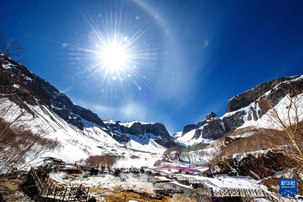 游客在长白山北景区观赏火山自溢温泉(2024年3月26日摄)。
